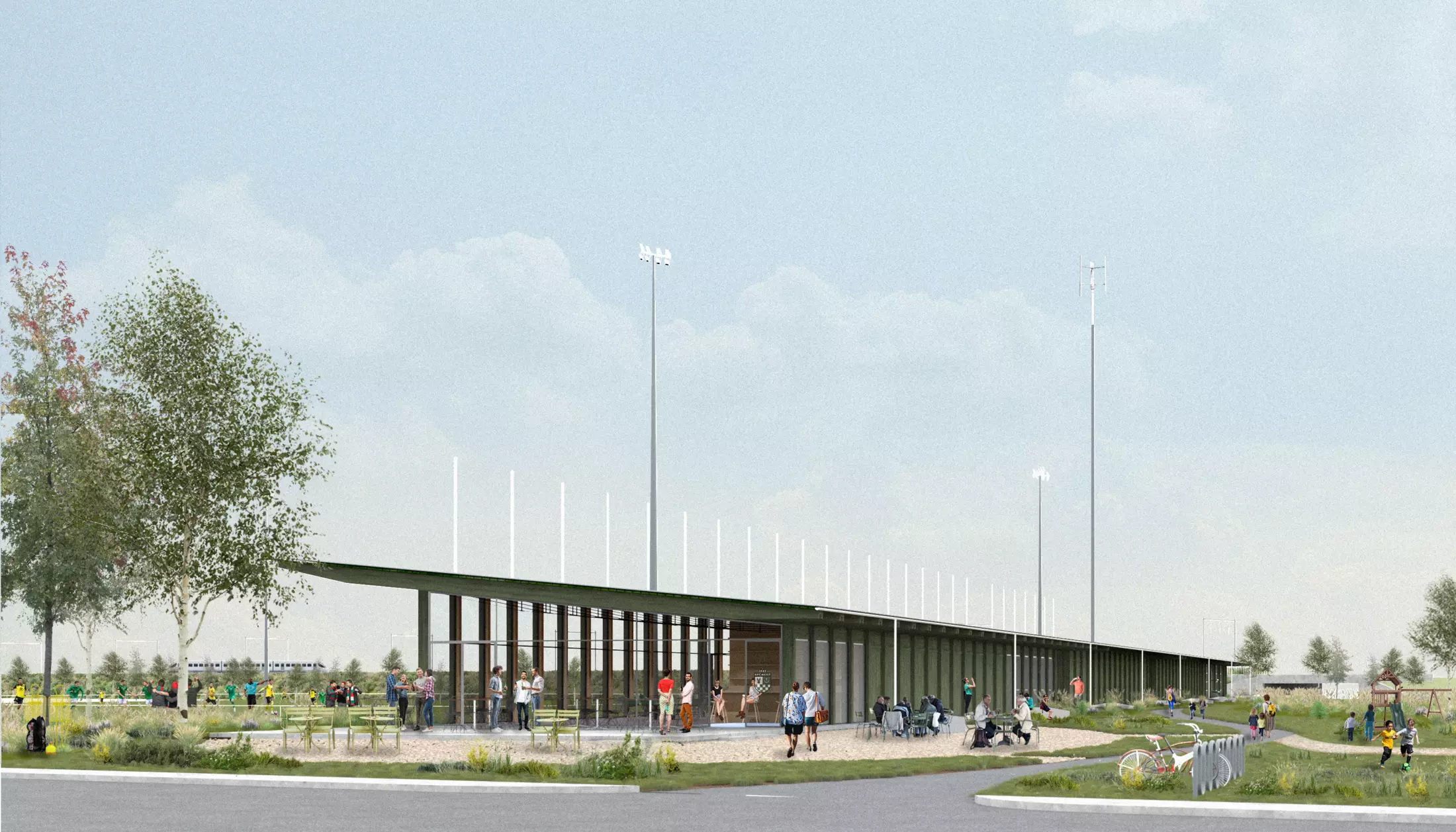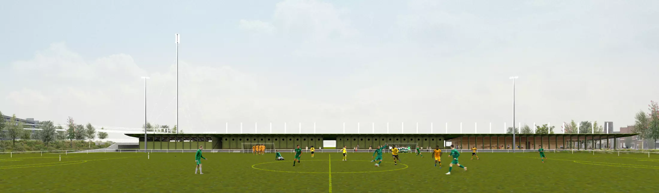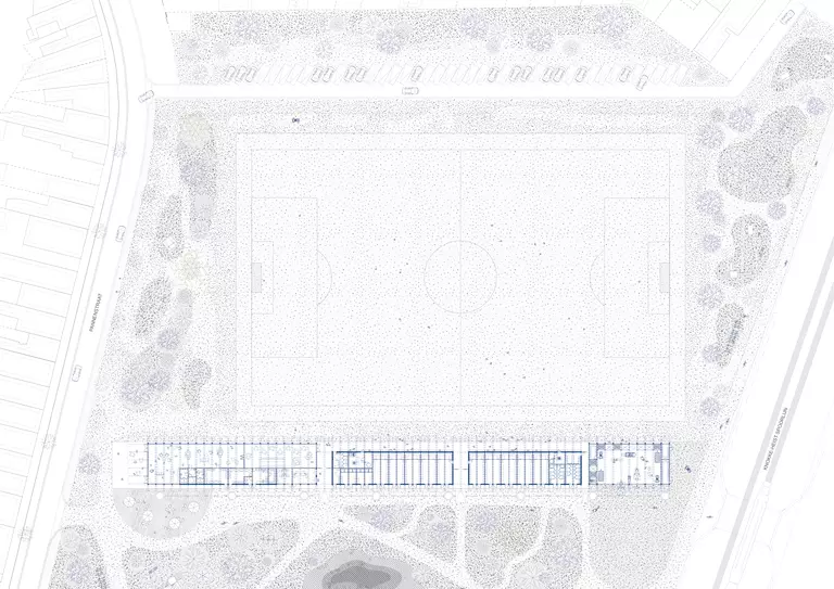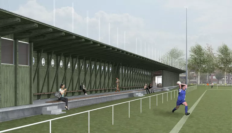 Strategically positioned between the old facilities and the primary field, the new stadium acts as a catalyst for the broader transformation of the site. The clubhouse is situated at ground level to be both literally and figuratively accessible, serving a broad social function beyond sport alone. This sustainable investment facilitates a high-quality environment for youth and sports operations while establishing a vital public connection to the surrounding cycling axes and neighbouring sports centers.