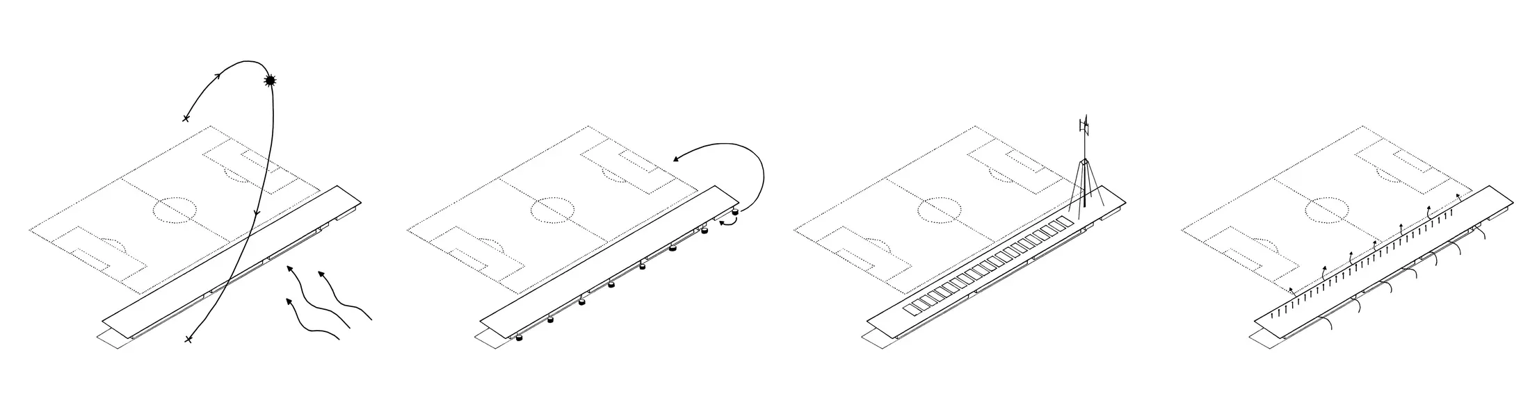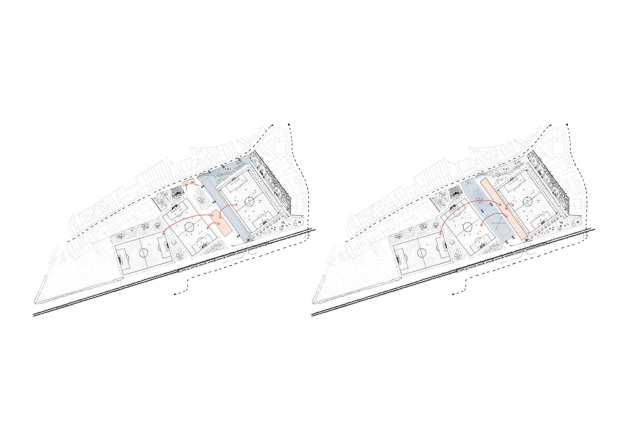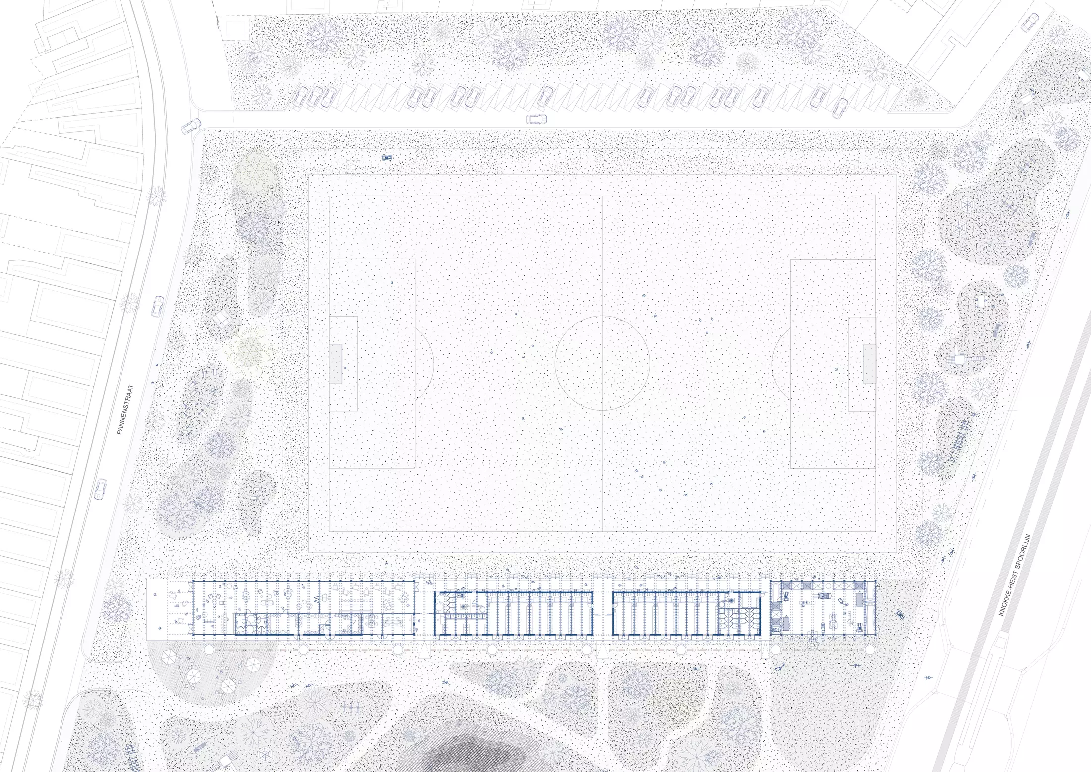 Strategically positioned between the old facilities and the primary field, the new stadium acts as a catalyst for the broader transformation of the site. The clubhouse is situated at ground level to be both literally and figuratively accessible, serving a broad social function beyond sport alone. This sustainable investment facilitates a high-quality environment for youth and sports operations while establishing a vital public connection to the surrounding cycling axes and neighbouring sports centers.