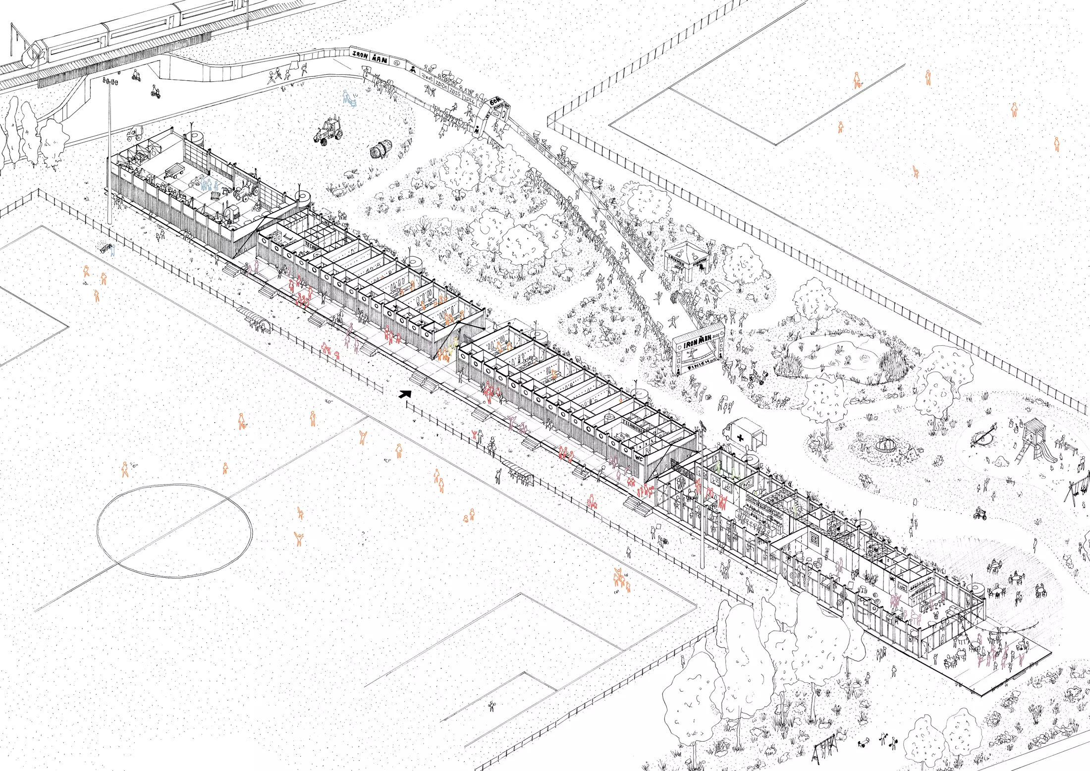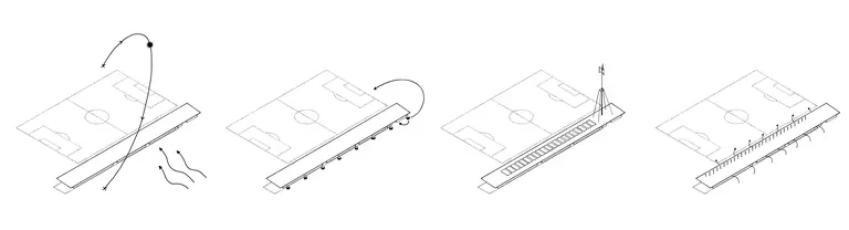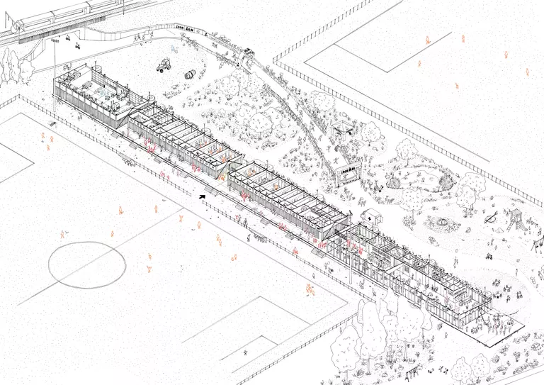 The architectural concept utilizes a modular, prefabricated "building kit" system that allows for a fast, cost-efficient, and flexible construction process. This repetitive system is specifically designed to be placed on-site without the need for foundation excavation works, minimizing environmental impact. Because the building is composed entirely of prefab elements, the sports site can remain fully operational during construction, with the existing canteen and grandstands only being demolished once the new structure is complete.