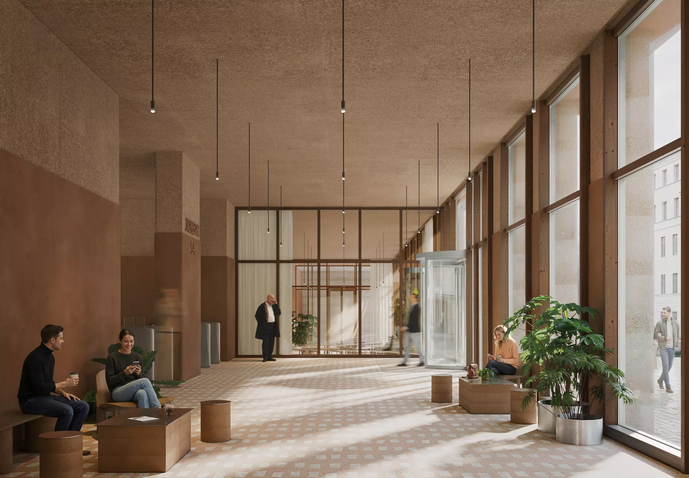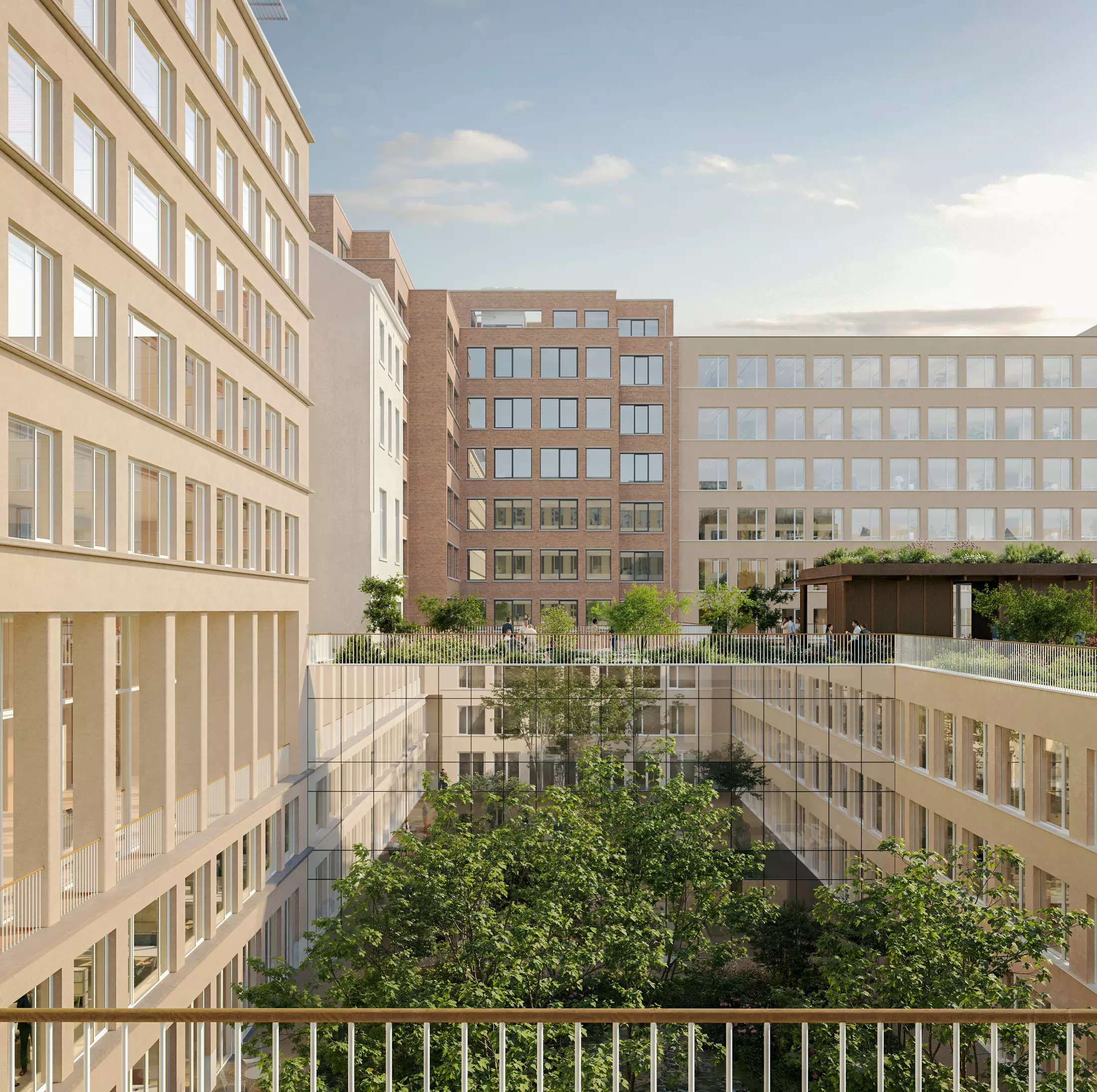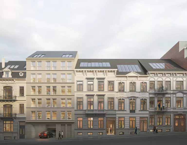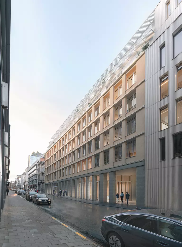On Rue Joseph II, this results in a double-height lobby overlooking the inner courtyard, street-facing terraces, and space for a public function. The semi-circular top floors are replaced by a lightweight timber extension with terraces. On Rue de Deux Églises, the historic façade is restored and reactivated through an atrium with walkways and natural light.